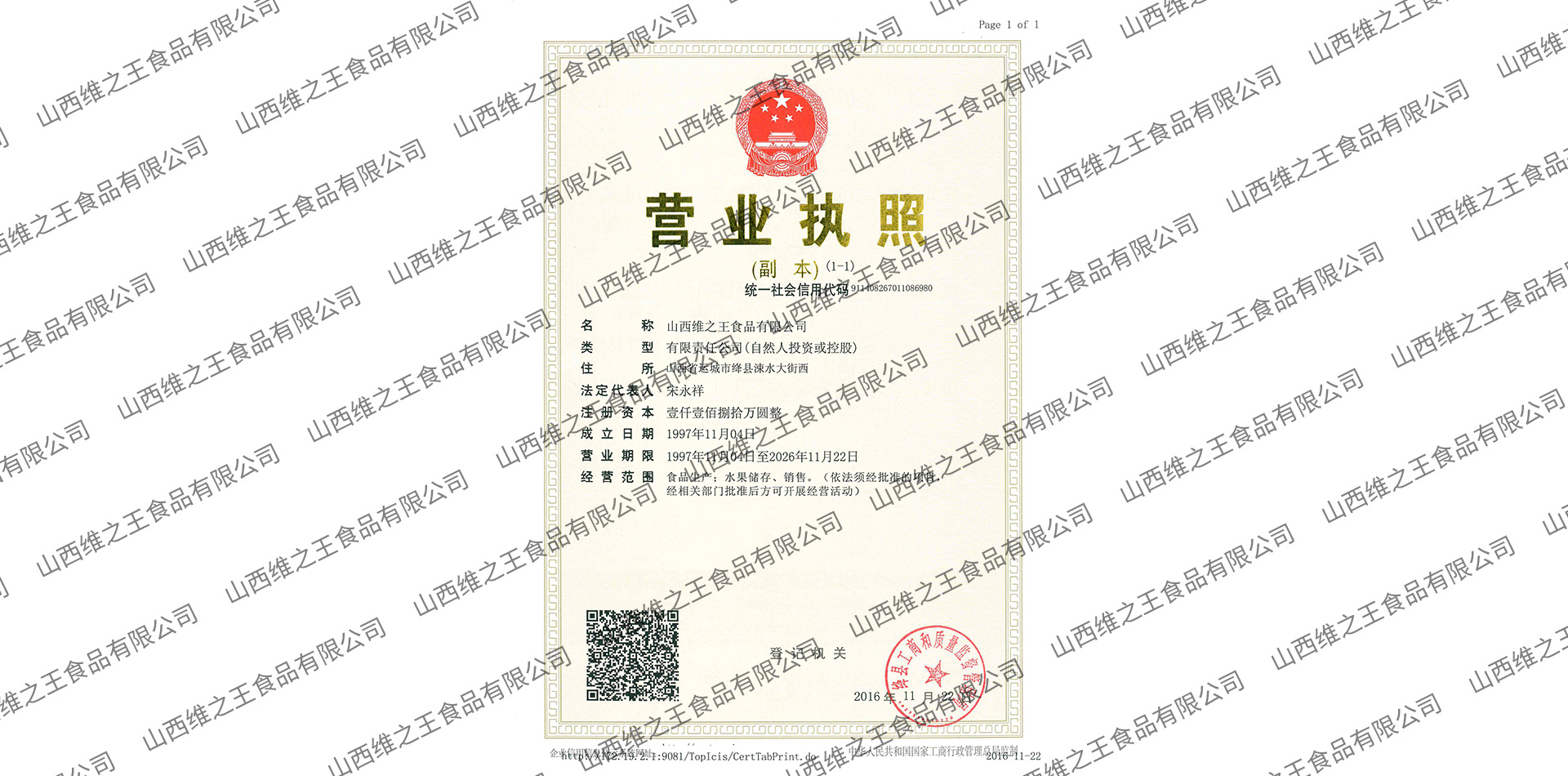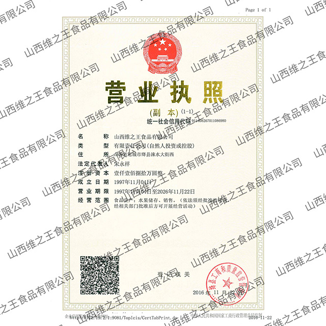 山西維之王食品有限公司坐落在交通便利、風(fēng)景秀美的“山楂之鄉(xiāng)”—山西絳縣。公司創(chuàng)建于1997年,主要從事以山楂為主的多種果蔬產(chǎn)品加工、研發(fā)和銷(xiāo)售。曾被評(píng)為全國(guó)農(nóng)產(chǎn)品加工示范企業(yè)、全國(guó)鄉(xiāng)鎮(zhèn)企業(yè)創(chuàng)名牌重點(diǎn)企業(yè)、山西省農(nóng)業(yè)產(chǎn)業(yè)化重點(diǎn)企業(yè)和“513”工程省級(jí)梯次企業(yè)、省級(jí)科技民營(yíng)企業(yè)、山西省模范集體,曾被國(guó)家八部委認(rèn)定為農(nóng)業(yè)產(chǎn)業(yè)化重點(diǎn)龍頭企業(yè),曾是中華人民共和國(guó)國(guó)家標(biāo)準(zhǔn)《蜜餞通則》、《果醬通則》、《山楂制品》起草單位之一。